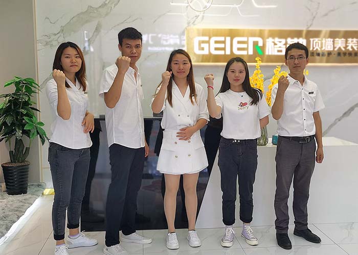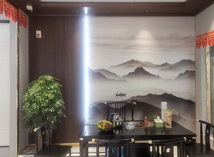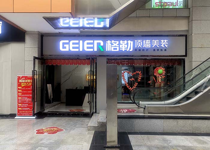 一进入店里,干净整洁的环境让人感觉非常舒适。作为顶墙一体店,店内的吊顶、墙面等装修用的也是格勒的产品,可以说是“一步一景”,无需进入样板间,只在曲折回转间便能见到格勒顶墙之美。