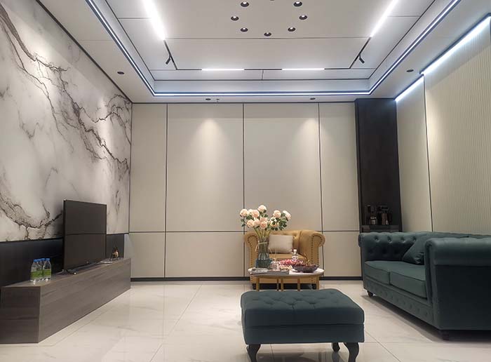 一进入店里,干净整洁的环境让人感觉非常舒适。作为顶墙一体店,店内的吊顶、墙面等装修用的也是格勒的产品,可以说是“一步一景”,无需进入样板间,只在曲折回转间便能见到格勒顶墙之美。